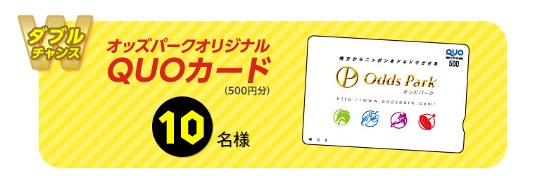 また、ダブルチャンスとして、上記賞品に当選した方以外の方の中から抽選で10名様にオッズパークオリジナルQUOカード(500円分)をプレゼントいたします。
