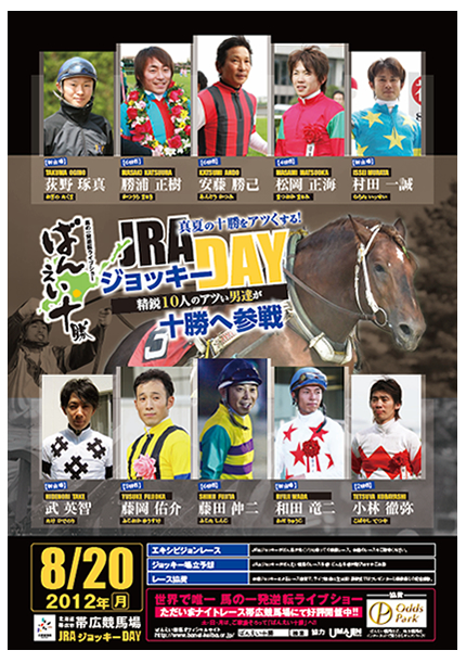帯広競馬場において2012年8月20日(月)に実施された「JRAジョッキーDAY 第6回エキシビションレース」。第1レースは荻野琢真騎手が圧勝し、第2レースは小林徹弥騎手が先行逃げ切りのレースで優勝。