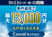 選べるミッション!【条件達成でもれなく最大13,000円分】9月23日(火・祝)の競輪 払戻金獲得 Casualミッション 終了