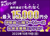 【条件達成でもれなく最大15,000円分】10月19日(日)の伊勢崎・山陽オートレース 払戻金獲得ミッション