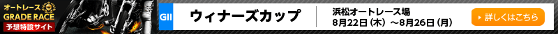 2019年8月22日(木)〜8月26日(月)に開催される浜松オートレースの勝車投票券(重勝式を含む)をオッズパークで合計3,000円以上購入し、キャンペーンに応募いただいた方の中から抽選で、現金1万円を10名様、現金5,000円を20名様、ウィナーズカップ(GII)オリジナルQUOカード(500円分)を10名様にプレゼントいたします。