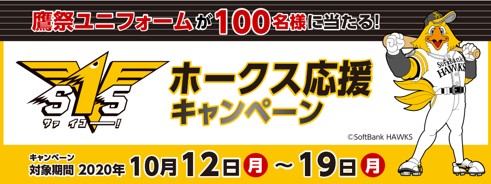 2020年10月12日(月)〜10月19日(月)に開催される地方競馬・競輪・オートレースの投票券(重勝式を含む)をオッズパークで合計3,000円以上購入し、キャンペーンに応募いただいた方の中から抽選で、鷹の祭典2020専用ユニフォーム(レプリカ)を100名様にプレゼントいたします。