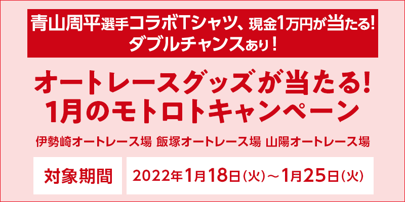 2022年1月18日(火)〜1月25日(火)に開催されるオートレースの重勝式車券(モトロトBIG・モトロトmini)をオッズパークで合計5,000円以上購入(モトロトBIG・モトロトminiをそれぞれ1,000円以上購入することが必要)し、キャンペーンに応募いただいた方の中から当選者を以下の手順により選出します。