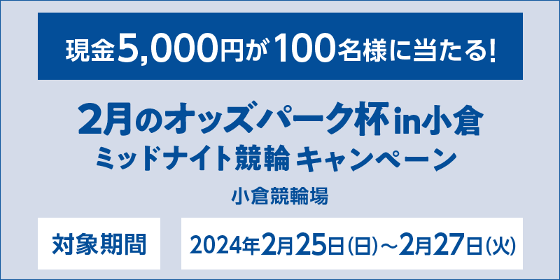 2024年2月25日(日)〜2月27日(火)に開催される小倉競輪の勝者投票券をオッズパークで合計5,000円以上購入し、キャンペーンに応募いただいた方の中から抽選で、現金5,000円を100名様にプレゼントいたします。