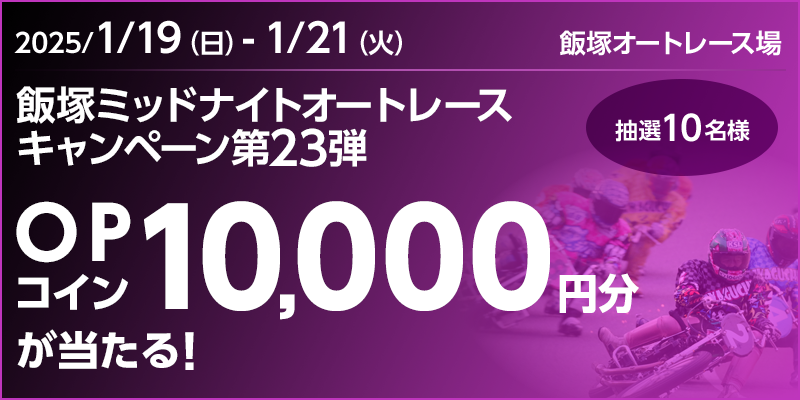 対象期間中に開催される、飯塚オートレースの勝車投票券(重勝式を含む)をオッズパークで合計1,000円以上購入すること。